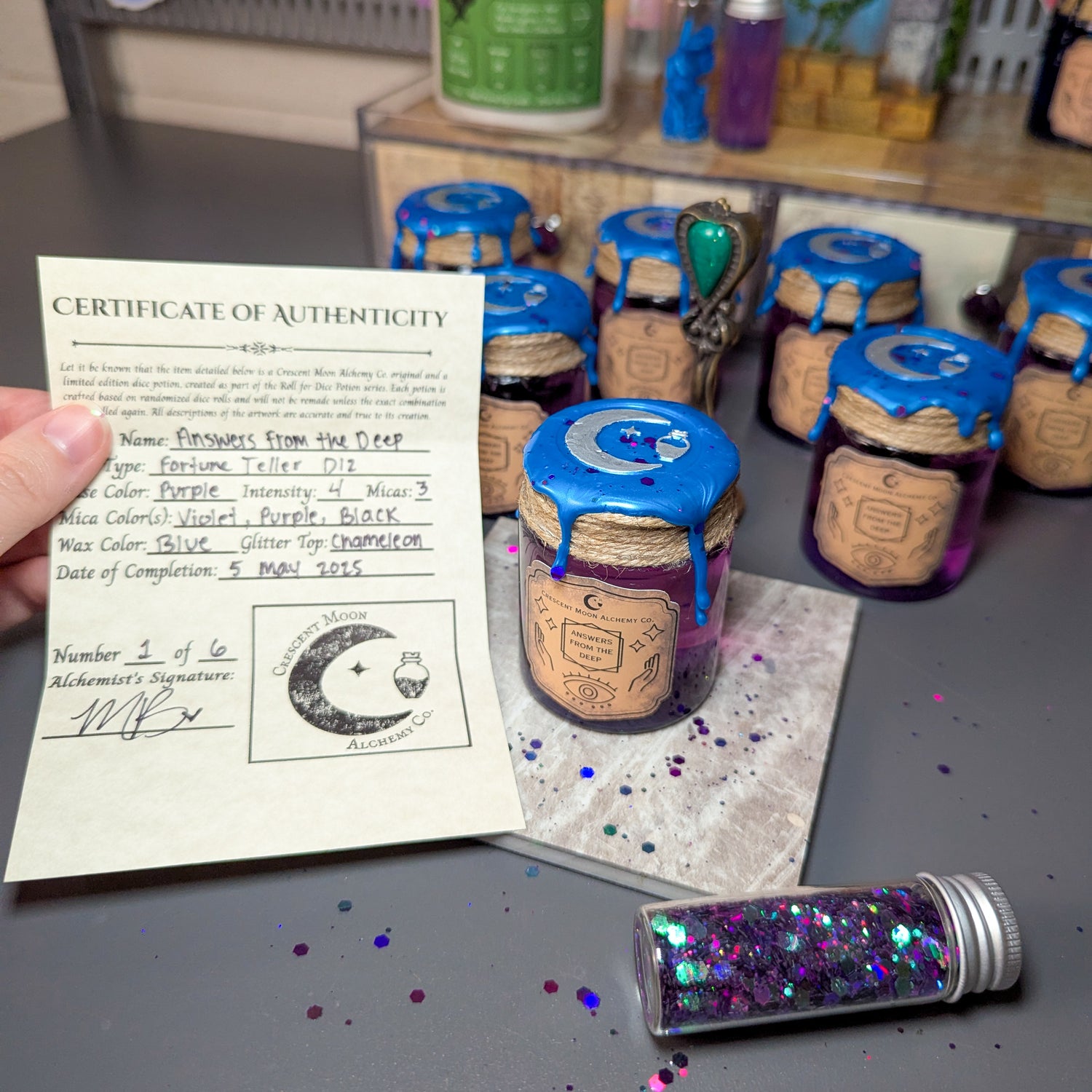 Roll for Dice Potion is an original TikTok series where the dice gods decide every detail of a one-of-a-kind potion! From dice type to colors, glitter, and wax seals, there's no telling what combination will be rolled next!