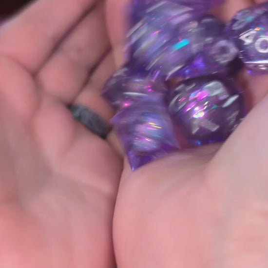 Unleash a little bit of magic next game night with a set of our liquid core dice! These stunning violet dice feature silver numbering and a glitter filled liquid core. Gaze into these dice and you'll see glimpses of colors like purple, blue, green, and pink. Complete with the Crescent Moon Alchemy Co. emblem on the D20, these unique dice are sure to turn heads at your next geeky get-together!!!