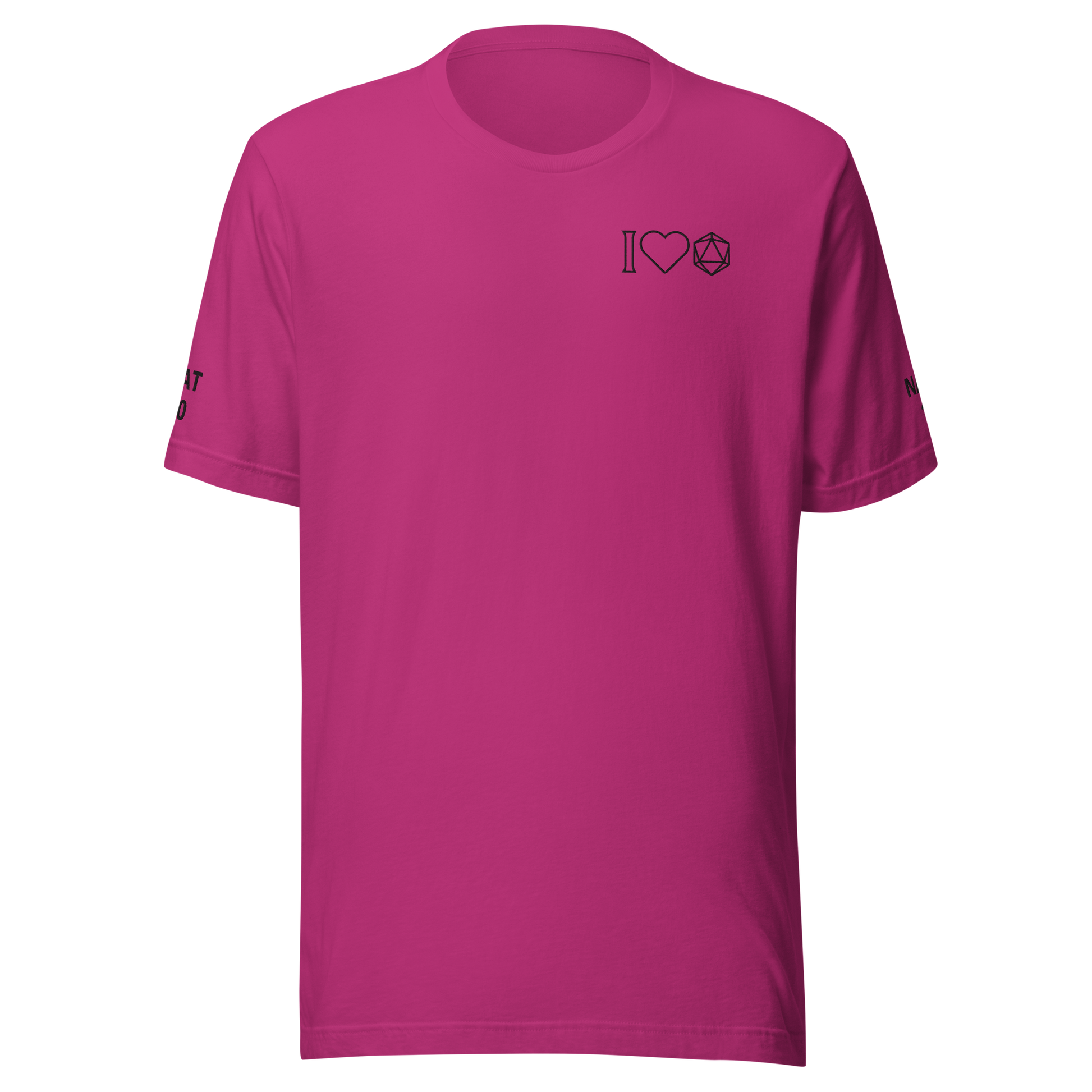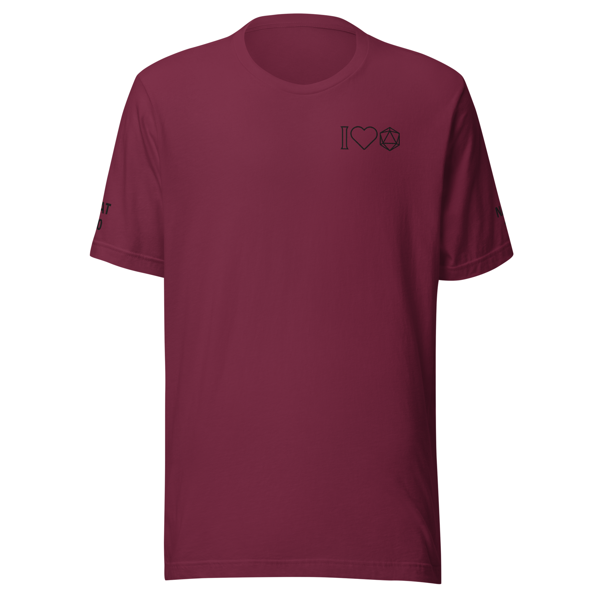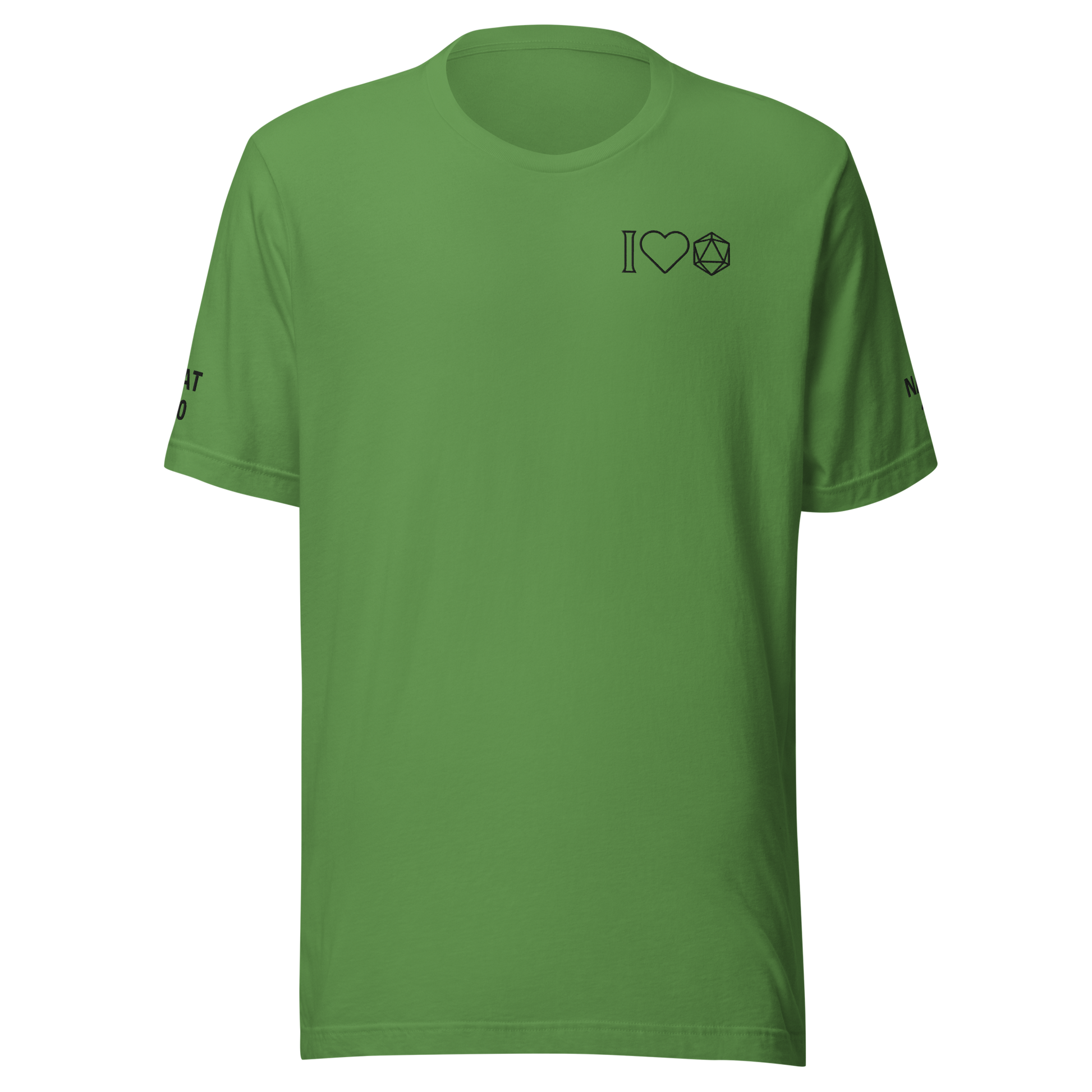Our Dice Goblin Tee features three embroidered details, "Nat 20" of the right sleeve, "Nat 1" on the left sleeve, and "I <3 Dice" on the chest.