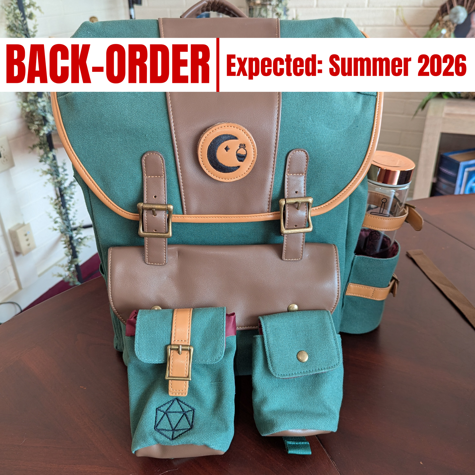 It features a water-resistant interior, a padded laptop sleeve, and removable side pouches for flexible storage. The front zipper pocket includes protective sleeves for our Signature Floating Dice Potions, along with a mesh pocket for smaller items. The exterior water bottle pocket is perfectly sized for our Ultimate Game Night Bottle, but comfortably fits 16–24 oz drinks as well, with an additional interior bottle strap for larger bottles. We’ve also included a removable logo patch that can be swapped for any Velcro patch of your choice.